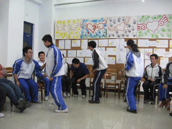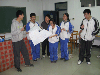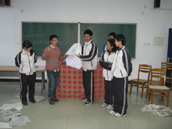 在“大风吹”等热身游戏中,同学们欢笑一堂,彼此熟悉,也展现了同学们的智慧。随后陈老师指导大家进行了团队间的“坦克大战”。同学们被分为五个团队,活动规则之每个团队要利用一定量的报纸和胶带制成一个简易的履带,团队中的每位队员都要站在履带中,全体队员靠手脚来推动履带前进,最先到达终点的团队胜出。在制作履带的过程中,每位成员都充分运用自己的聪明才智和动手能力,充分展现出了团队精神。随后的比赛过程则十分激烈,三、四两个团队的小组赛更是充满了火药味,你争我赶,唯恐落下,“1,2;1,2”的加油口号声此起彼伏,队员们齐心协力一起向前冲,第三团队的绝佳配合让他们取得了最后的胜利。