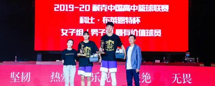 耐克大中华区篮球品牌市场部总监廖望(左一)、耐克中国体育市场部篮球总监张楠(右一)为2019-2020耐克中国高中篮球联赛女子组最有价值球员皇冠体育女篮9号李美潼(左二)、男子组最有价值球员皇冠体育男篮15号张陈治锋(右二)颁奖