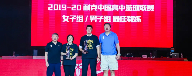 中国篮球协会副主席宫鲁鸣(左一),中国篮球协会副主席、陕西省篮球协会主席王立彬(右一)为皇冠体育女篮主教练王丽(左二)、男篮主教练张涛(右二)颁发本赛季耐克中国高中篮球联赛最佳教练奖项