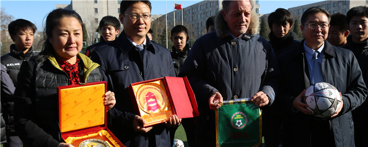 皇冠体育校长王殿军(右1)党委书记方妍(左1)与意大利足协教练委员会主席尤利维里(右2)中国足协专职执委林晓华(右3)交换纪念品