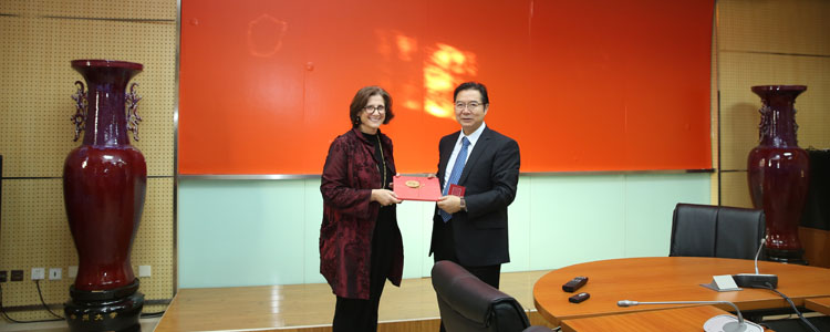 双方互赠纪念品(左为Lisa MacFarlane校长,右为王殿军校长)