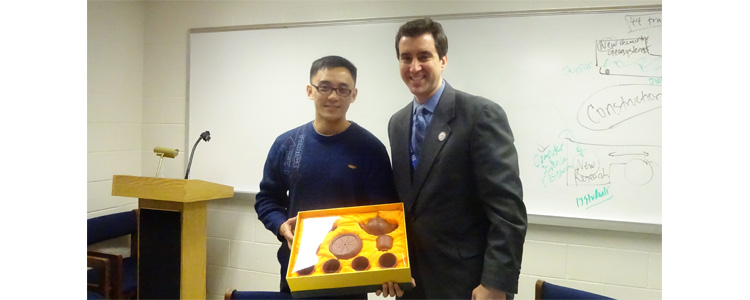 皇冠体育教师代表周喆(左)与托马斯•杰斐逊科技高中校长互赠纪念品