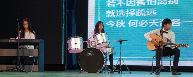 11年级学生马倩怡(左1)、丰最怡(左2)、杨爽然为原创诗朗诵《离人心上》伴奏