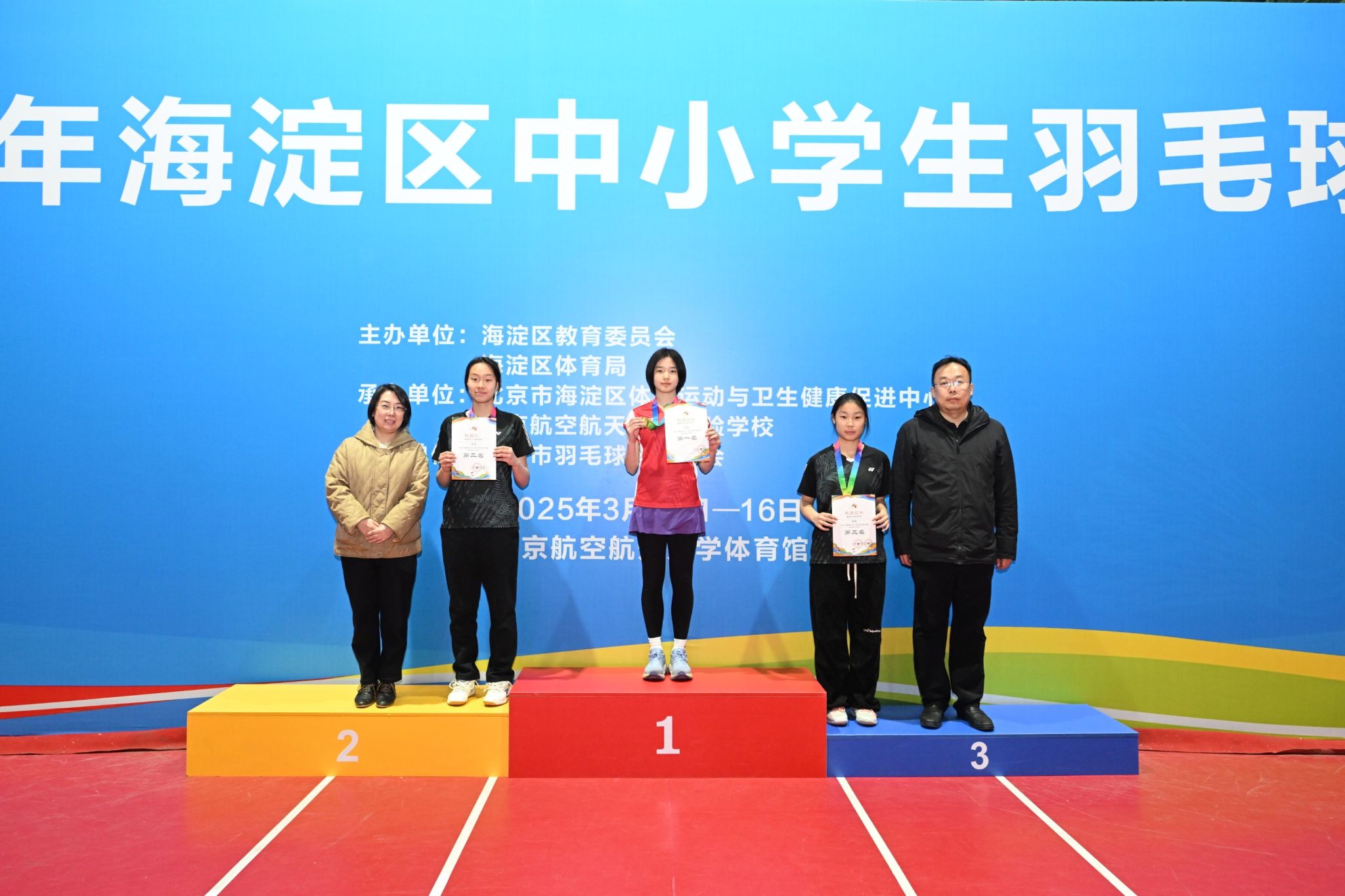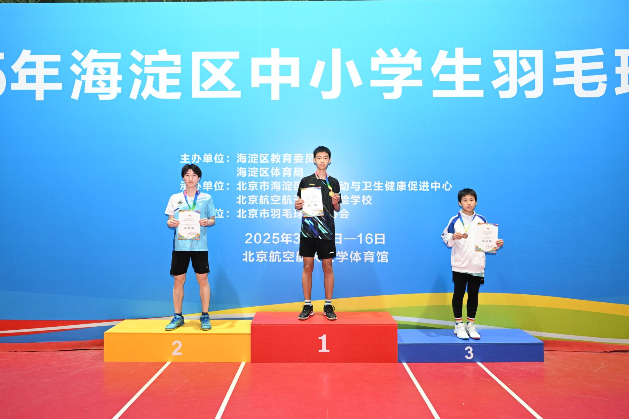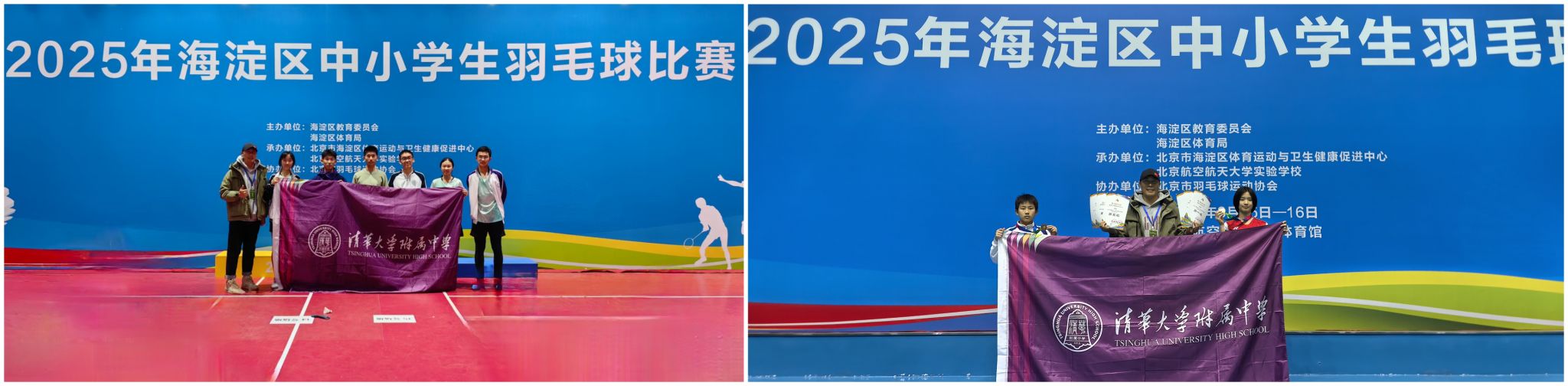 2025年海淀区中小学生羽毛球比赛于3月15、16日在北京航空航天大学体育馆拉开序帷幕。本次比赛共计1513人参赛,皇冠体育11名队员参加。经过两天的激烈角逐,我校普通生羽毛球校代表队奋勇拼搏,最终斩获初中组女单冠军、男单季军,高中组男双、混双第五名以及初中组混双第五名的优异成绩,展现了学校羽毛球运动的蓬勃发展与队员们的青春风采。