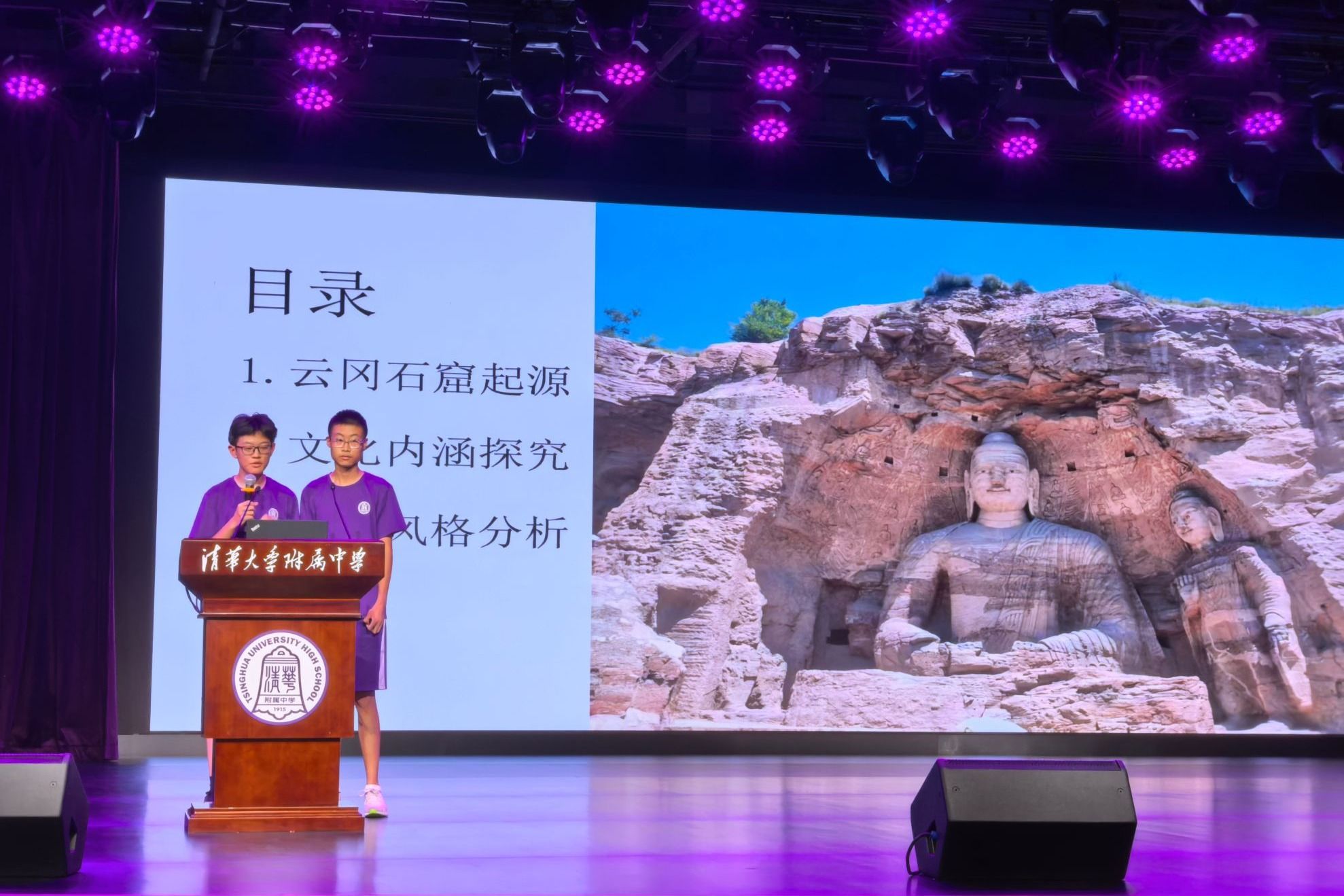 大同线路的同学们将目光聚焦于云冈石窟的艺术魅力与历史价值。初2303班李诚服同学和李宜轩同学详细介绍了云冈石窟的起源、文化内涵与艺术风格。云冈石窟的佛像造型庄严肃穆,飞天雕刻姿态优美,线条流畅自然,原始色彩虽历经岁月变迁仍韵味犹存。同学们深刻认识到,云冈石窟不仅是佛教东传的重要载体,更体现了西域文化与中原文化的融合创新,是世界文化遗产中璀璨的瑰宝。