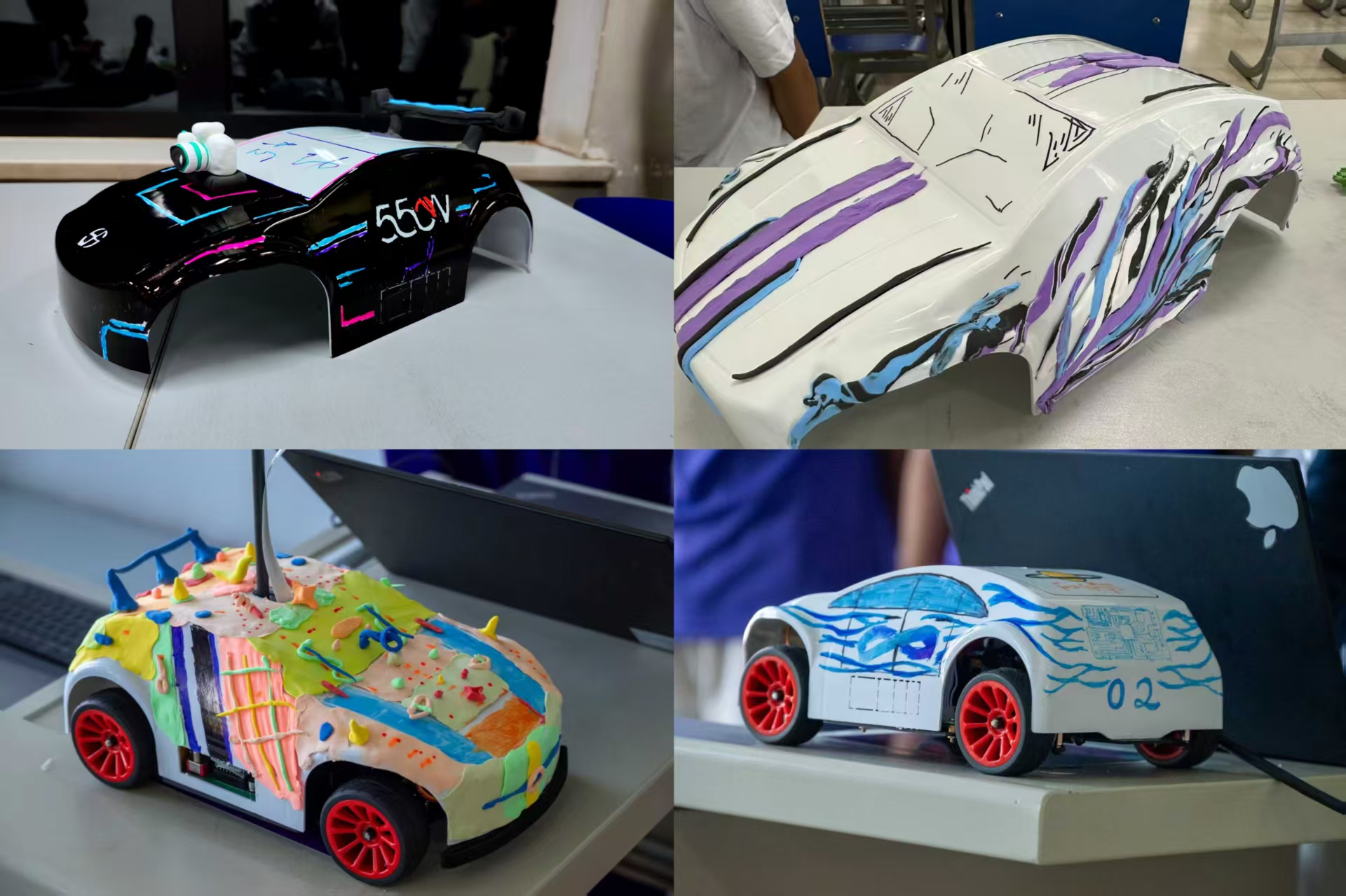 9月11日为“创意设计日”,同学们专注于智能小车的车身设计与美化,并参加“车身设计奖”评选。各组作品风格多样,既有科技未来主题,也有环保、传统文化和抽象艺术元素,体现出优秀的综合审美与团队协作能力。