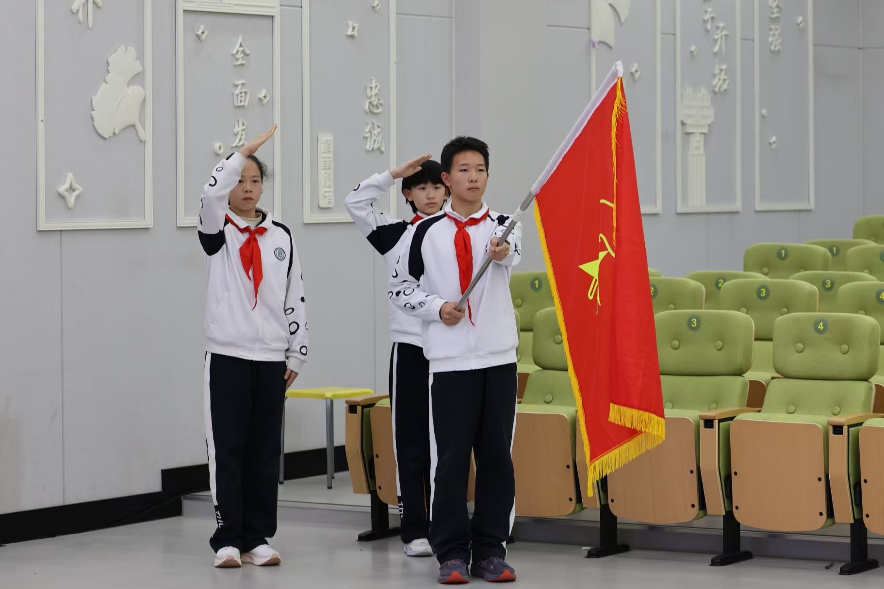 少先队员代表首先向来宾老师们敬献红领巾,随后,大会在庄严的出旗仪式和嘹亮的队歌声中拉开帷幕。少先大队辅导员付帅老师作年度工作报告,系统回顾了一年来皇冠体育官网少先大队在政治启蒙、体育竞技、艺术展示、志愿服务和组织建设等方面的扎实成效。初中学生会主席陈一诺也作了年度汇报。全体代表认真审议并表决通过了工作报告。