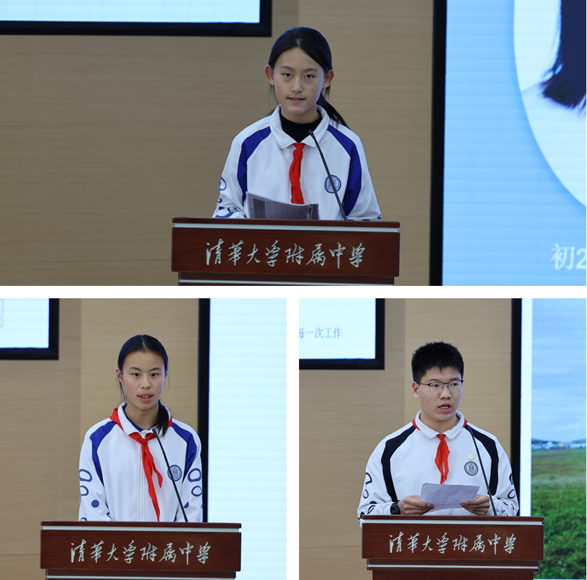 初2417班褚思齐、初2415班王雅欣、初2513班王飞翰进行竞选发言