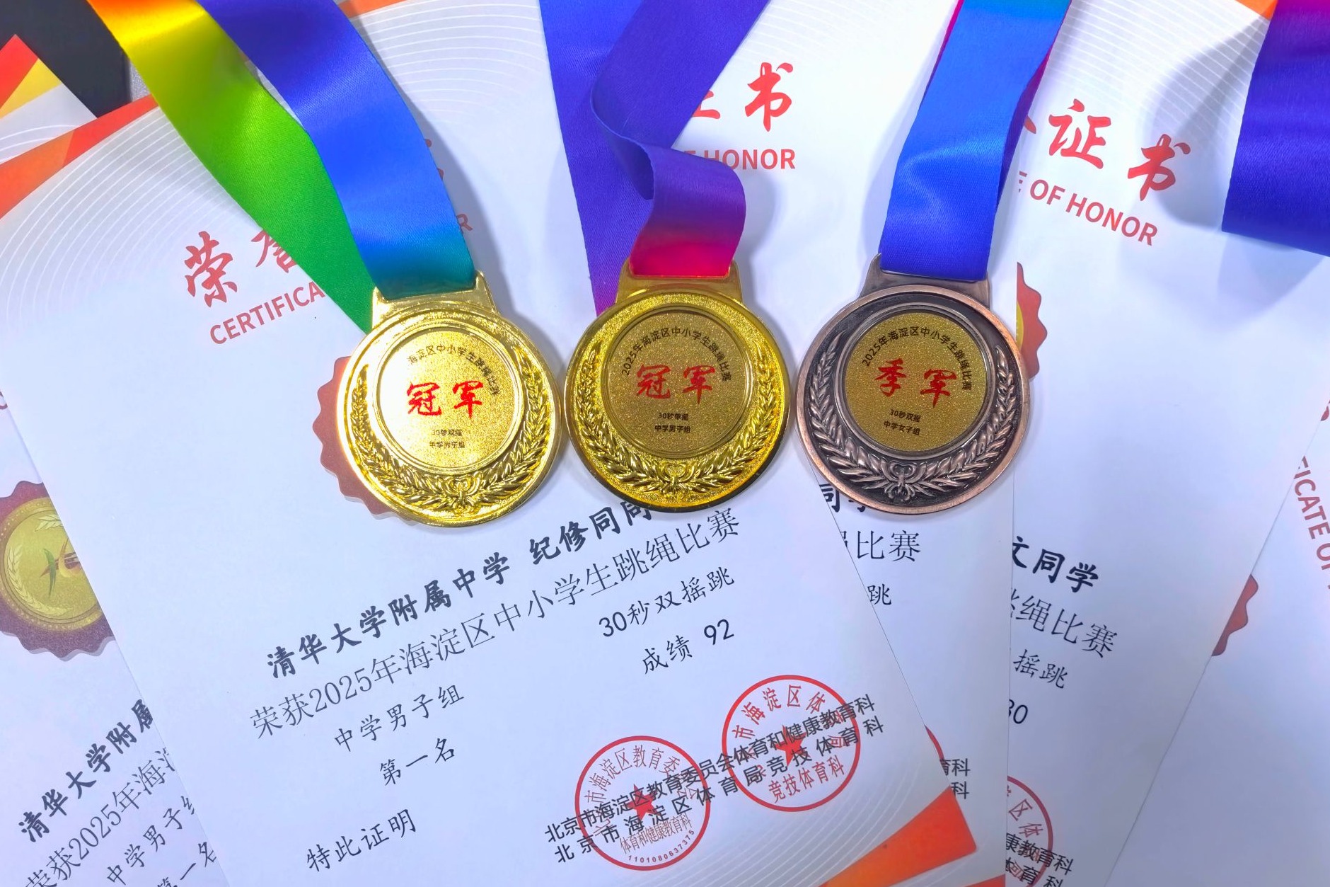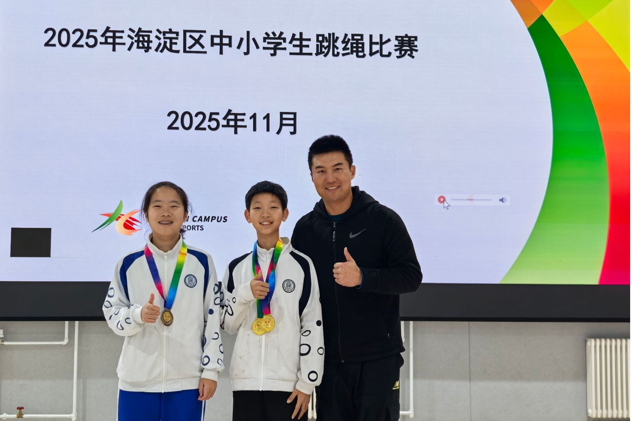 11月22日,海淀区中小学跳绳比赛在人大附中第二分校举行。在教练付帅老师的带领下,皇冠体育官网跳绳队首次组队参赛,派出4名同学迎战来自全区多所中学的选手。队员们沉着应战、发挥出色,最终斩获2金1铜,并取得单项第五名、第八名的优异成绩,展现了附中学子良好的体育素养与团队精神。