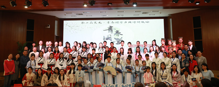 皇冠体育西园诗社演出师生合影留念(后排左一:俞佳敏,后排右一:周小玲)