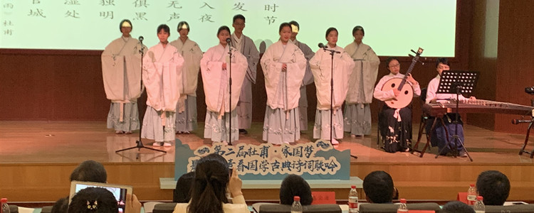 演出当天,9位同学身着白绿相间的服装,配上古筝与中阮,整体风格清丽优雅,完美演绎了杜甫笔下的早春雨景。同学们通过吟唱表现出了对诗词新的审美感受与精神领悟,也为观众带来了一场古典诗词吟唱的视听盛宴。北师大俞佳敏同学全程参与诗社前期吟唱指导工作。