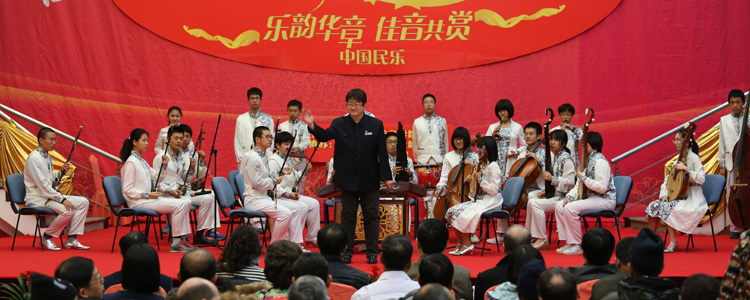 音乐会开场,胡军指挥乐团为外国友人们演奏了《花好月圆》和《瑶族舞曲》两首人们耳熟能详的中国民乐经典力作,同学们精彩的演奏赢得了观众们阵阵热烈的掌声和叫好声。之后,乐团的古筝独奏演员王惠仪同学上场,她为观众们带来了独奏曲《丰收锣鼓》,热烈激昂的曲调从她纤细的指尖流淌出来,引得外军将领们频频拍照录像。乐团的打击乐首席、曾经获得2012年CCTV民乐器乐大奖赛金奖的罗嘉鈺同学,此次为观众们奉献的,是她的获奖作品《楚汉决战》,泼辣的台风、急促的鼓声,把音乐会推向了一个小小的高潮。与乐团多次合作的中国古琴大师杨青携爱徒徐镝清演奏了《梅花三弄》和《酒狂》两首古琴经典名曲,悠扬的古韵,婉转的情怀,让人仿佛穿越了时空,近距离地接触到了中华古韵的魅力。