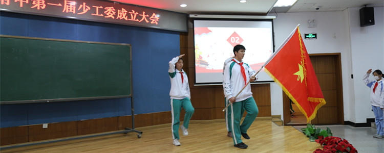 在激奋人心的国歌声中,少工委成立大会正式开始。伴着铿锵有力的出队旗音乐声,旗手高举中国少年先锋队队旗,在护旗手的护卫下,迈着矫健的步伐走上舞台,鲜红的队旗迎风飘扬。