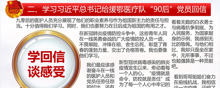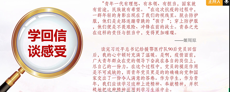 本次主题团日围绕学习中国在全球抗疫中作出的贡献和习近平总书记给援鄂医疗队“90后”党员的回信两部分展开。