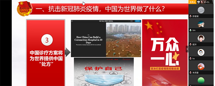 首先,各团支部主持人引导同学们思考:抗击新冠肺炎疫情,中国为世界做了什么?同学们从四个方面进行了深入的讨论。