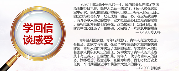 学习了总书记给援鄂医疗队90后的回信后,我深切感受到了习总书记对奋斗在前线的青年的鼓励与赞扬,并对这些志在助人的医护人员们产生了由衷的敬意。同时也认识到,我们作为新时代的少年,应当向这些无私奉献的人学习。不忘初心,砥砺前行。尽己所能,不负韶华!