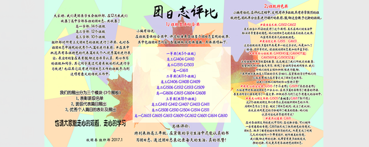 本次评比活动由校团委主办,团委组织部承办。从收集团日志伊始,该项活动就获得了高中学部各团支部及团员的积极响应。随后校团委组织部对各班团日志进行了综合评比。评比工作从日志的内容、设计和篇幅等方面,均衡考量,以量化方式进行评比。