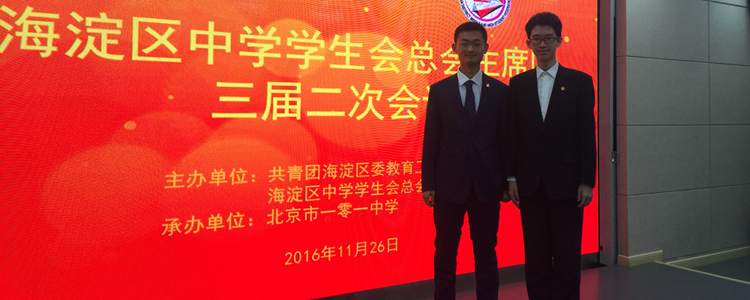 2016年11月26日,海淀区中学学生会总会主席团三届二次会议在北京市一零一中学召开。学生会总会主席团13所学校的27名代表参会。皇冠体育官网校团委书记任星阳、校学生会主席冷延鹏、校团委秘书长郭文轩代表学校参会。