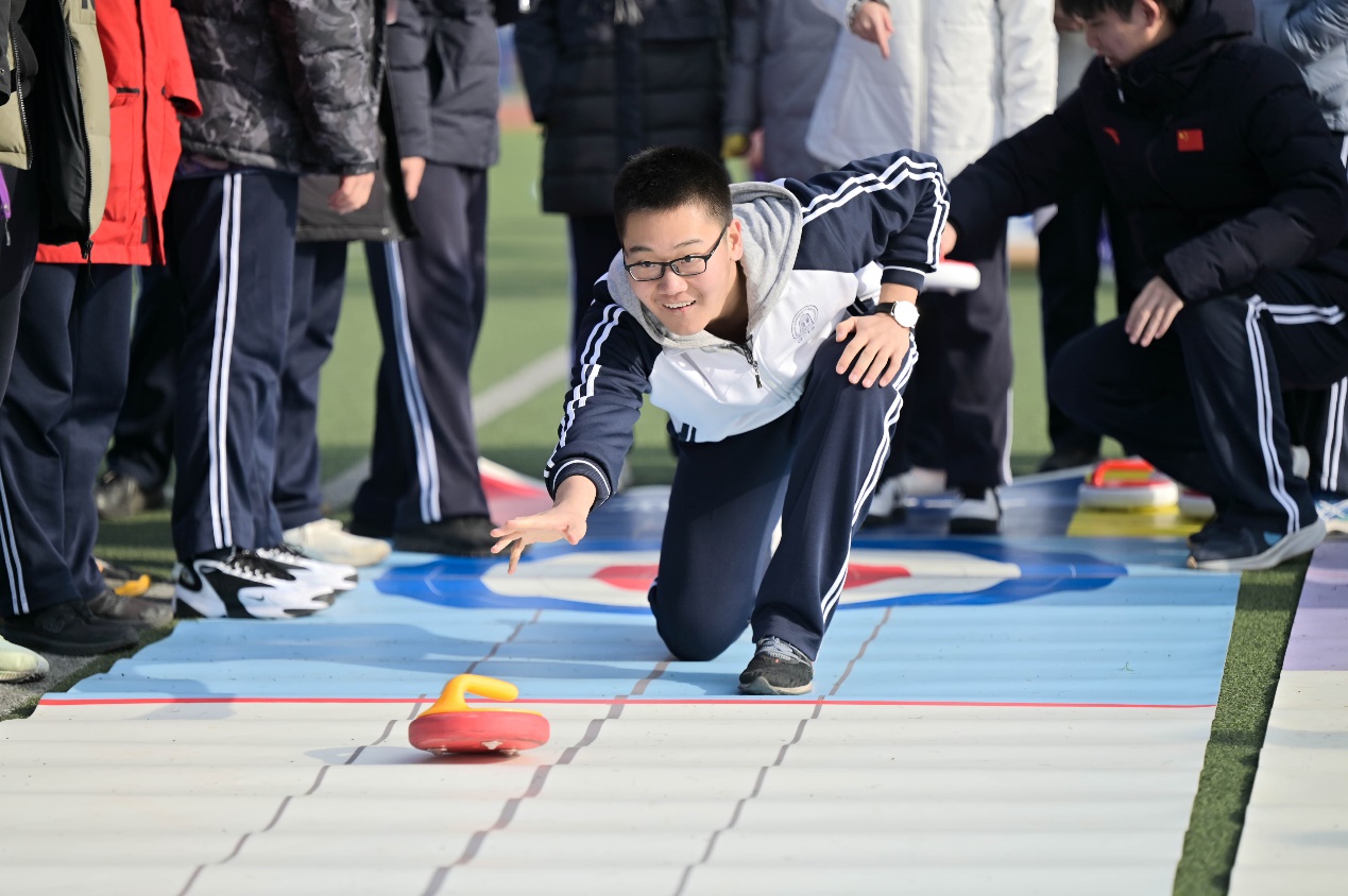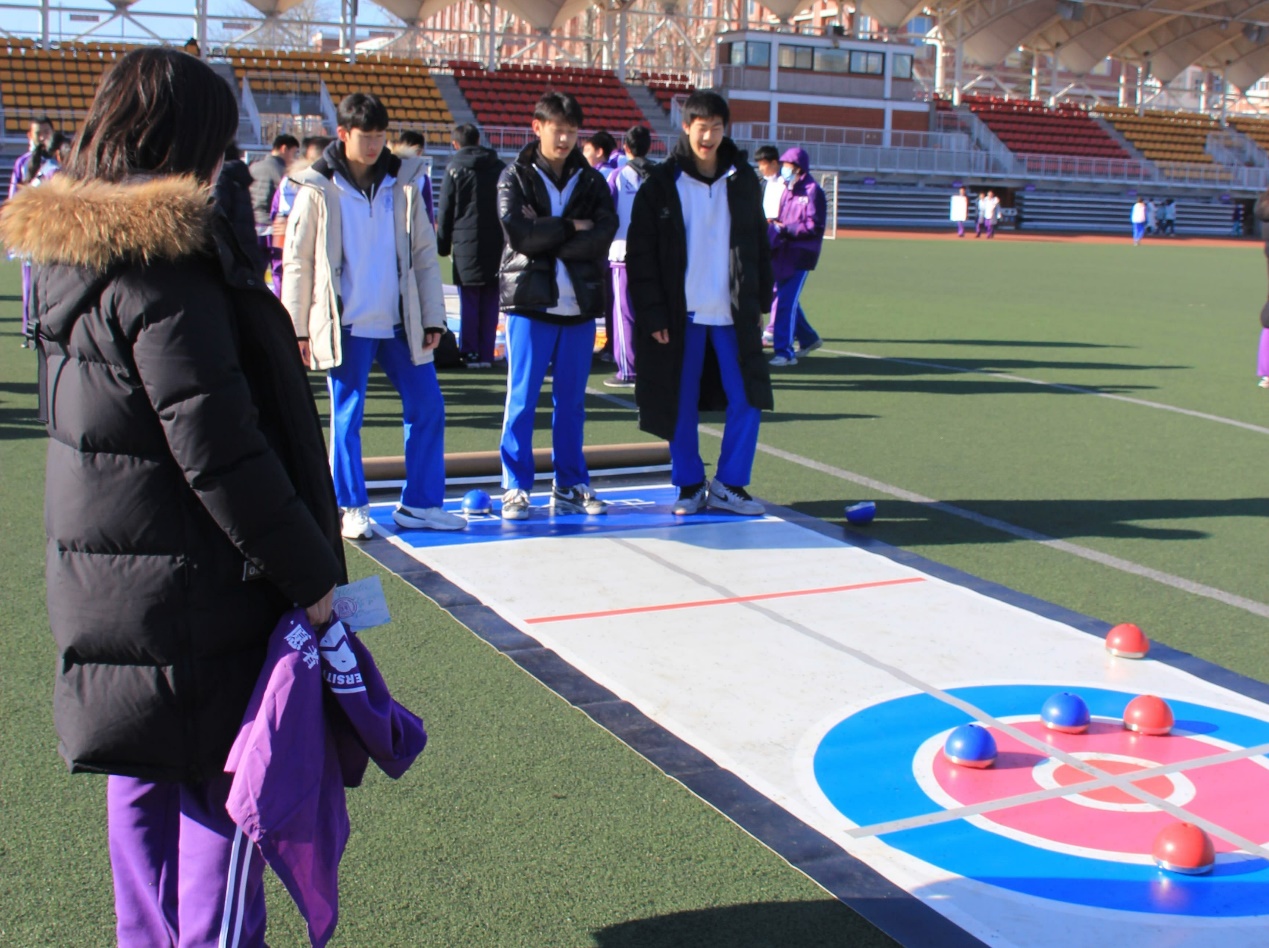 在冰蹴球和陆地冰壶的活动中,同学们在地上铺的仿真冰面地毯上积极体验。一次又一次的推出冰壶和冰蹴球,一次又一次的尝试将冰壶推到圈内,充分体现了不惧困难,不轻易放弃的体育精神。