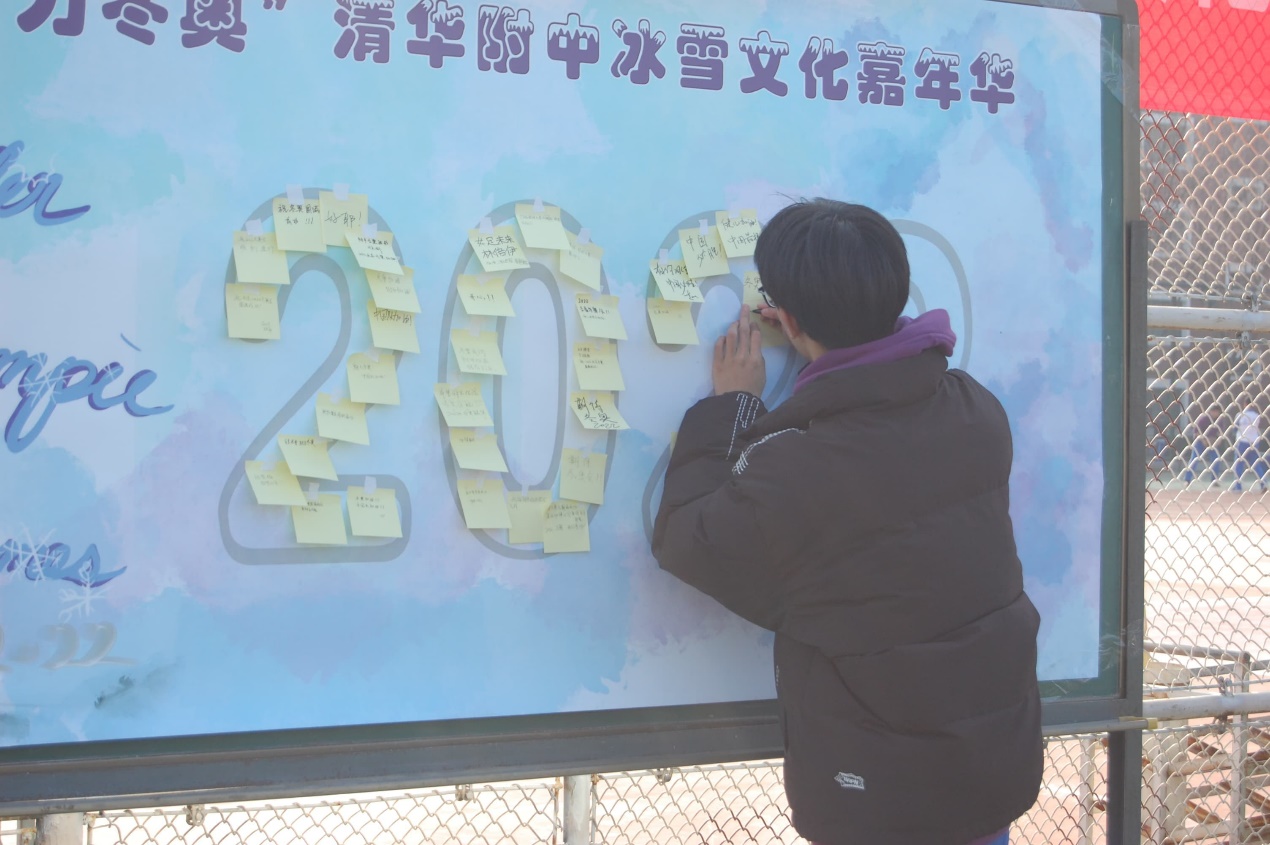 在主题合影和留言区,同学们在便签纸上写下对冬奥的美好祝愿,并和冬奥吉祥物——冰墩墩一起合影,留下美好回忆,展望冬奥。