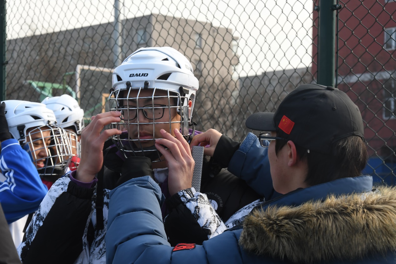 志愿者为参加冰球对抗项目的同学佩戴护具
