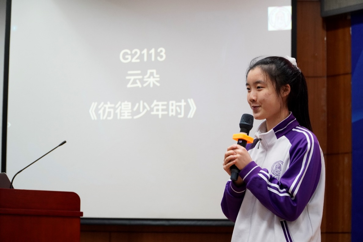 高2108班黄思瑞同学以“彷徨少年时”为题,举例描述自己小时遗憾彷徨的经历,与观众们产生共鸣,并由此深入到未来如何不再彷徨的思考。她运用诙谐幽默的语言,阐释出她独特的观点,大家都发出了会心的笑声。