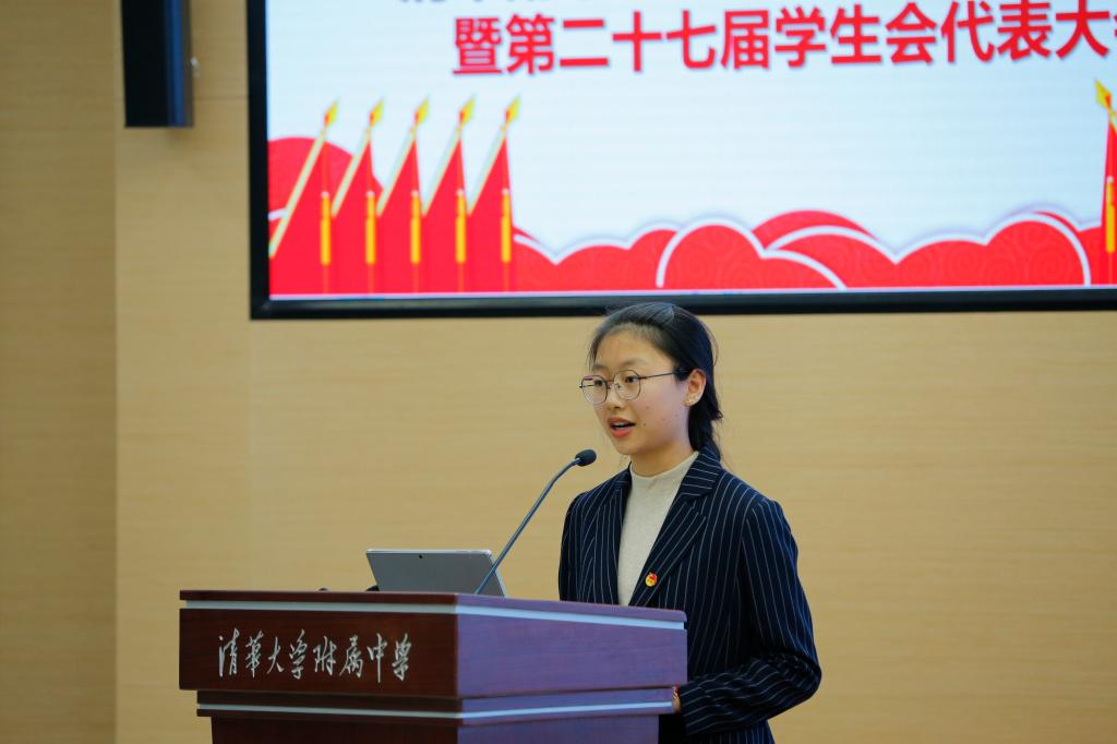 随后,学生会副主席汤一丹对皇冠体育官网学生会2021年的工作做了汇报和总结,概述了过去一年中组织的十大歌手、冰雪嘉年华、附中达人秀、线上学生节等活动和工作状况,并逐一介绍了体育部、外联部、学科部、文娱部、社团部、生活部的工作,表达了对新一年体制效率改进、更换新鲜血液的期待。