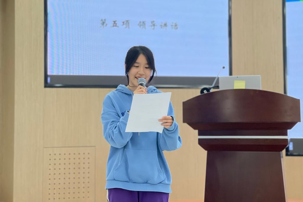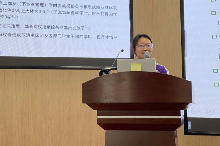 大会第四项,由团委副书记高2103班肖聿琳同学向大家介绍了学时发放的规则与部门量化表,细致精确的计分标准让团委学生会的运作更加科学有效。