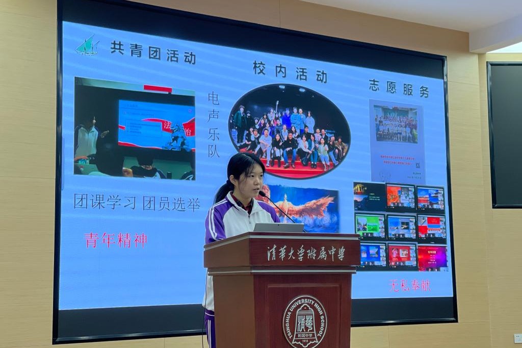 高中会场由学生会主席尹丝缘同学主持,团委书记任星阳老师首先进行了题为“‘清’春年华蓄势起,挺膺担当再出发”的讲话,带领同学们回顾校园文化,唤醒属于附中人的责任,并鼓励帮助同学们尽快回归校园生活。接下来团委副书记肖聿琳同学为大家介绍了本学期的学生活动安排。接着,高二年级17个班的班长进行述职,各班班长介绍了上学期在班级文化建设、思想政治教育、校园活动参与、学生个性发展等方面取得的成绩。在场的所有同学根据评分表进行打分。