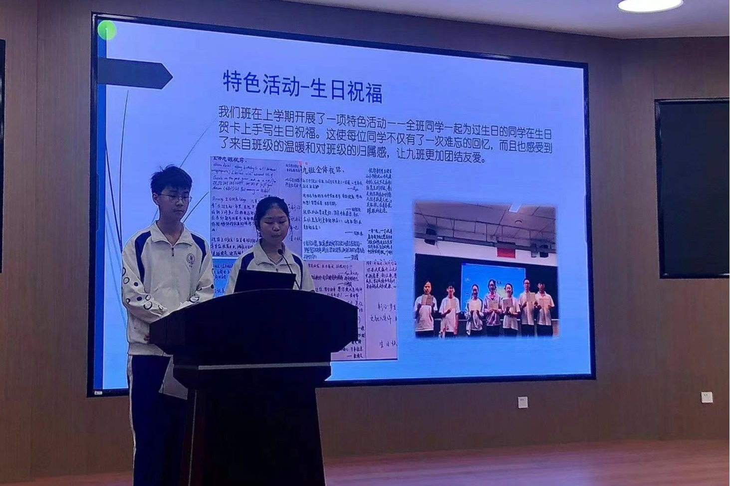 随后,初2102班和初2109班的代表分享了班级建设经验。初2102班主要从班级文化、行为规范、班级管理、慎独自律、特色和活动五个部分来介绍。作为艺术班,他们完美的发挥了自己在艺术方面的特长,积极投身到学校的艺术活动中,悠扬的音符飘扬在梧桐树下;优美的画卷点缀于附中校园里。此外,二班同学在向东佳老师的带领下积极开展小组活动和班级特色活动,班集体的每一位班干部倾力奉献、不计回报,打造了团结一心的“弦外丹青”。初2109班的同学从班名“乐学”的角度出发,详细讲解了如何建设有特色的班集体。有特色的班集体需要每位班干部别出心裁,强调要“专人专项专职;自律自觉自治”。在班主任潘老师的带领下,他们不断突破创新,吸取新鲜力量,争做优秀集体。