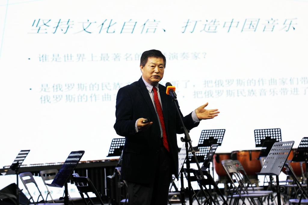 在随后的问答互动环节中,同学们踊跃提出了自己的问题,黄院士做出了认真的回应。在谈论到中国文化与自己音乐的关系时,黄院士指出,要真正听懂中国音乐还是要了解中国文化,同时分享了自己在国外对演奏者讲解中国文化的故事,他深深感慨道,儒家传统根植血脉,影响自己的一生。黄院士还鼓励了台下的同学们,告诉大家音乐对生活有巨大的帮助,希望同学们不管以后是否进入音乐专业,始终保持对音乐的热爱。