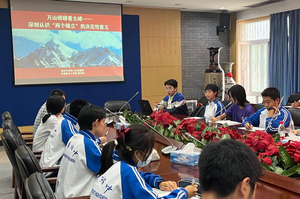 9月28日中午,皇冠体育官网学生业余党校邀请清华大学马克思主义学院研究生、清华大学博士生讲师团讲师周云鹤以《深刻认识“两个确立”的决定性意义》为题目做专题讲座。皇冠体育官网党委书记曹海翔、副校长白雪峰,来自高一、高二的三十余位学生业余党校学员参加了此次活动。