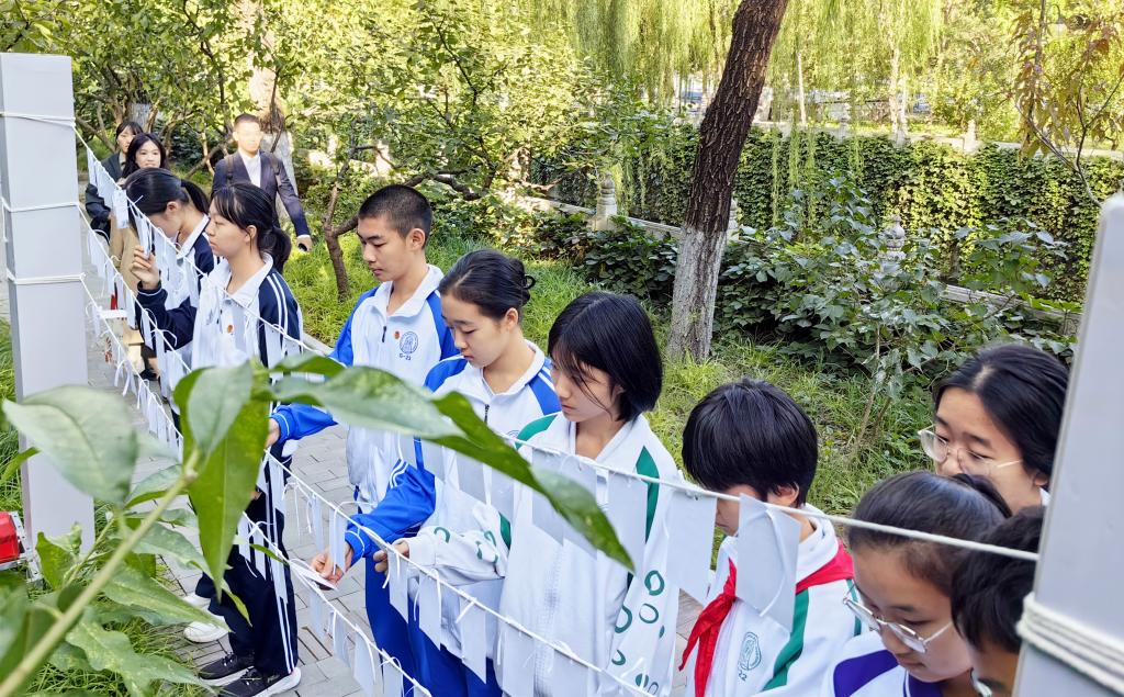 高一5班许浩诚(右一)与清华大学学生代表朗诵