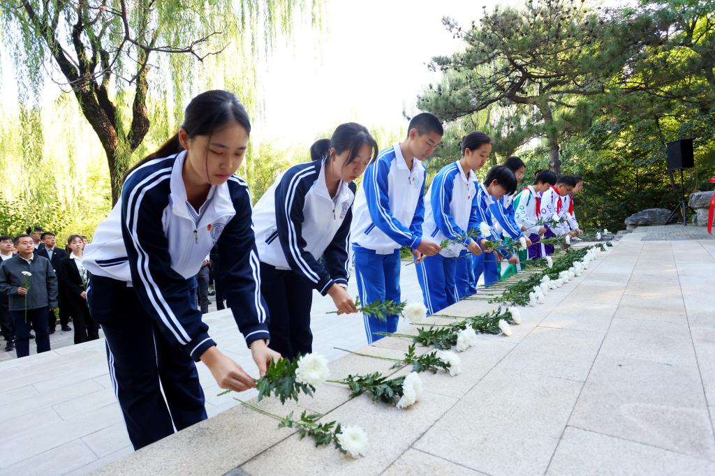 皇冠体育官网学生代表手持白菊缅怀英烈