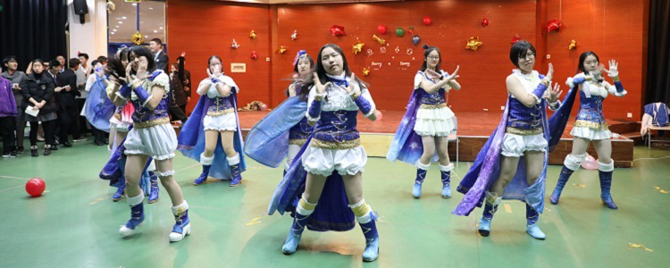 在进入舞会正题开始之前,电声社、劲舞社以及偶像研究社依次来到台上和舞池中,献出了非常精彩的演出。同学们纷纷围观,时时有赞叹之声。舞会现场的气氛,也随着三个社团的热情表演迅速升温。