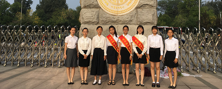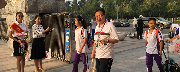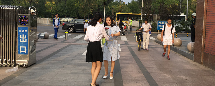 校园门口学生们向老师献花