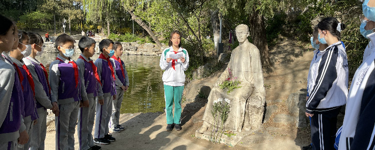 初1910班向彦霖在朱自清雕像前为附中、附小的学生讲解