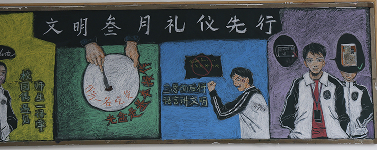 同学们利用粉笔诠释对语言文明、礼仪修养、卫生习惯等方面的认识。同学们在制作黑板报的过程中,也勉励自己,做到“博文约礼真君子,厚德自强附中人”。