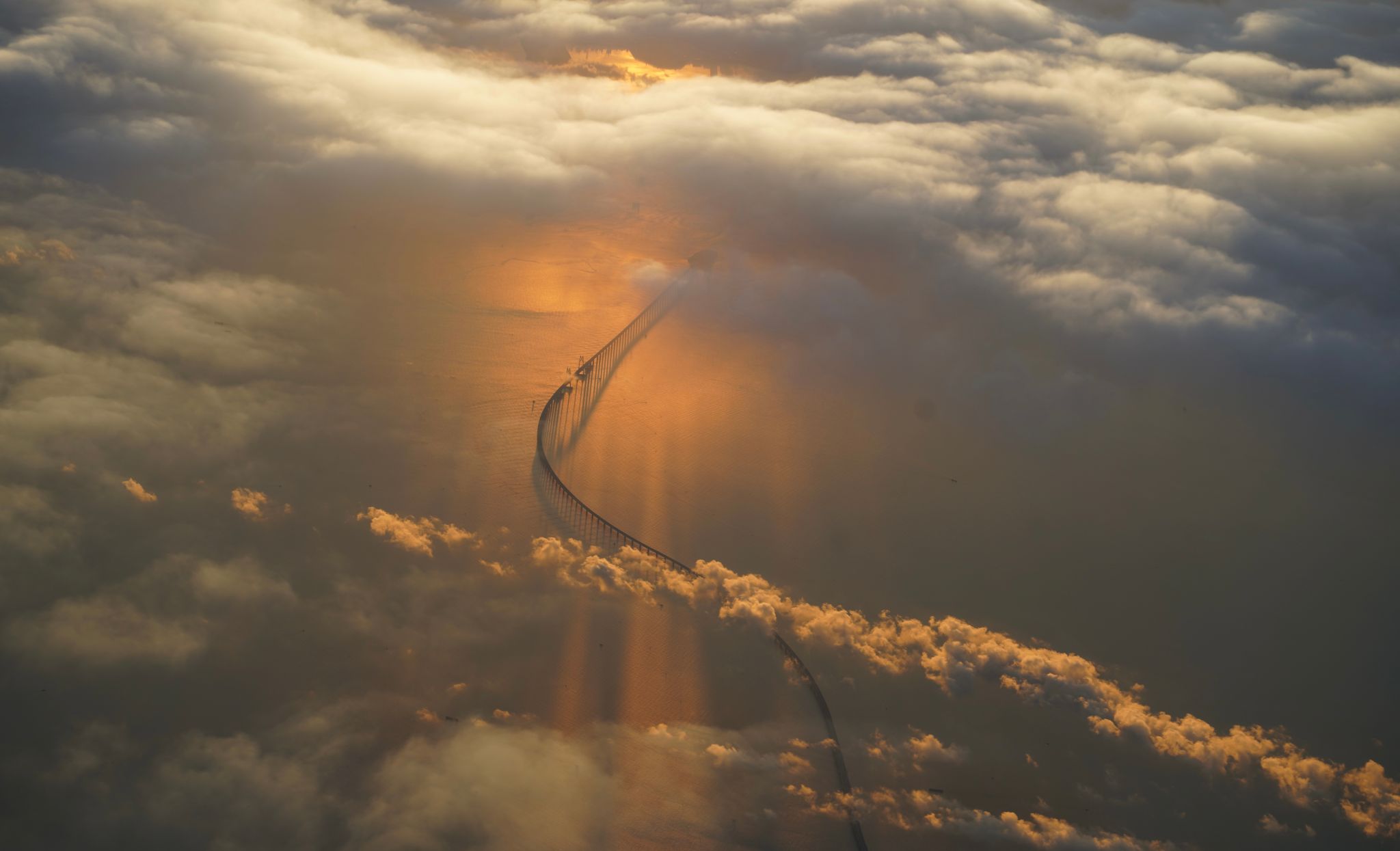 早晨6:15,晨曦微露,云海如棉絮般铺展,港珠澳大桥如巨龙般在云海与金光中蜿蜒穿梭。阳光穿透云层,洒下万道金辉,给大桥、云海镀上一层暖橙色泽。天地间仿佛只剩这桥、 这云、这光,静谧又壮丽,连通了天际与人间。彼时线条与光影,描绘出了人文工程与自然风光的交融之美。