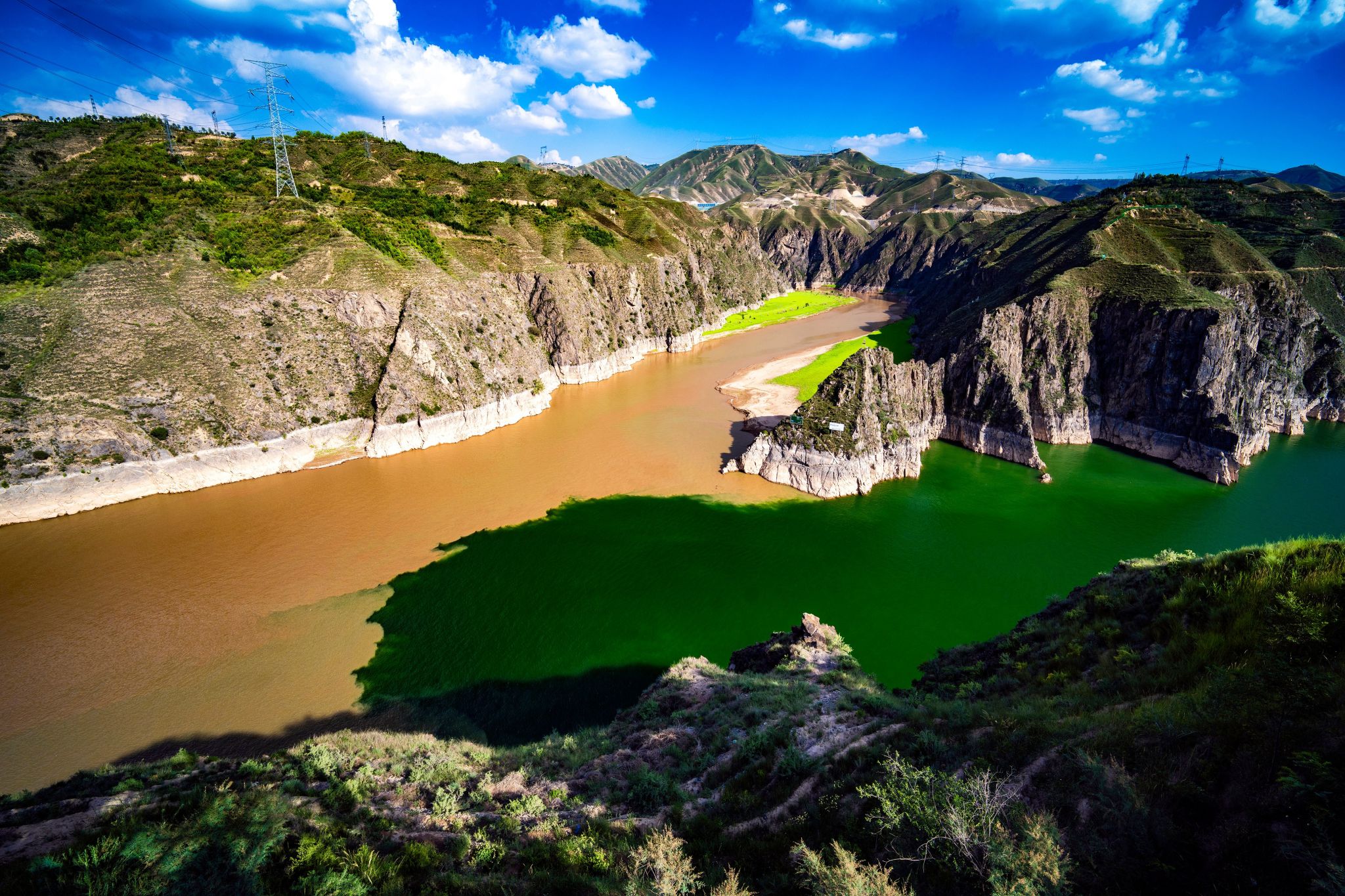 下午17时22分,甘肃临夏州永靖县刘家峡大坝上游的黄河与洮河交汇处,形成明显分界。黄河上游经青藏高原,含沙量低,水流清澈如翡翠,洮河流经黄土高原,裹挟泥沙,水色浑黄如琥珀。两河因密度、流速差异,交汇后暂未融合,形成清浊并流、泾渭分明的自然奇观。作品以16mm广角捕捉了碧波与金水相拥的景象,远山框景,云影点染,在粼粼波光中凝固了黄河“由清转黄”的地质奇观,诉说水流之力与时间之痕。