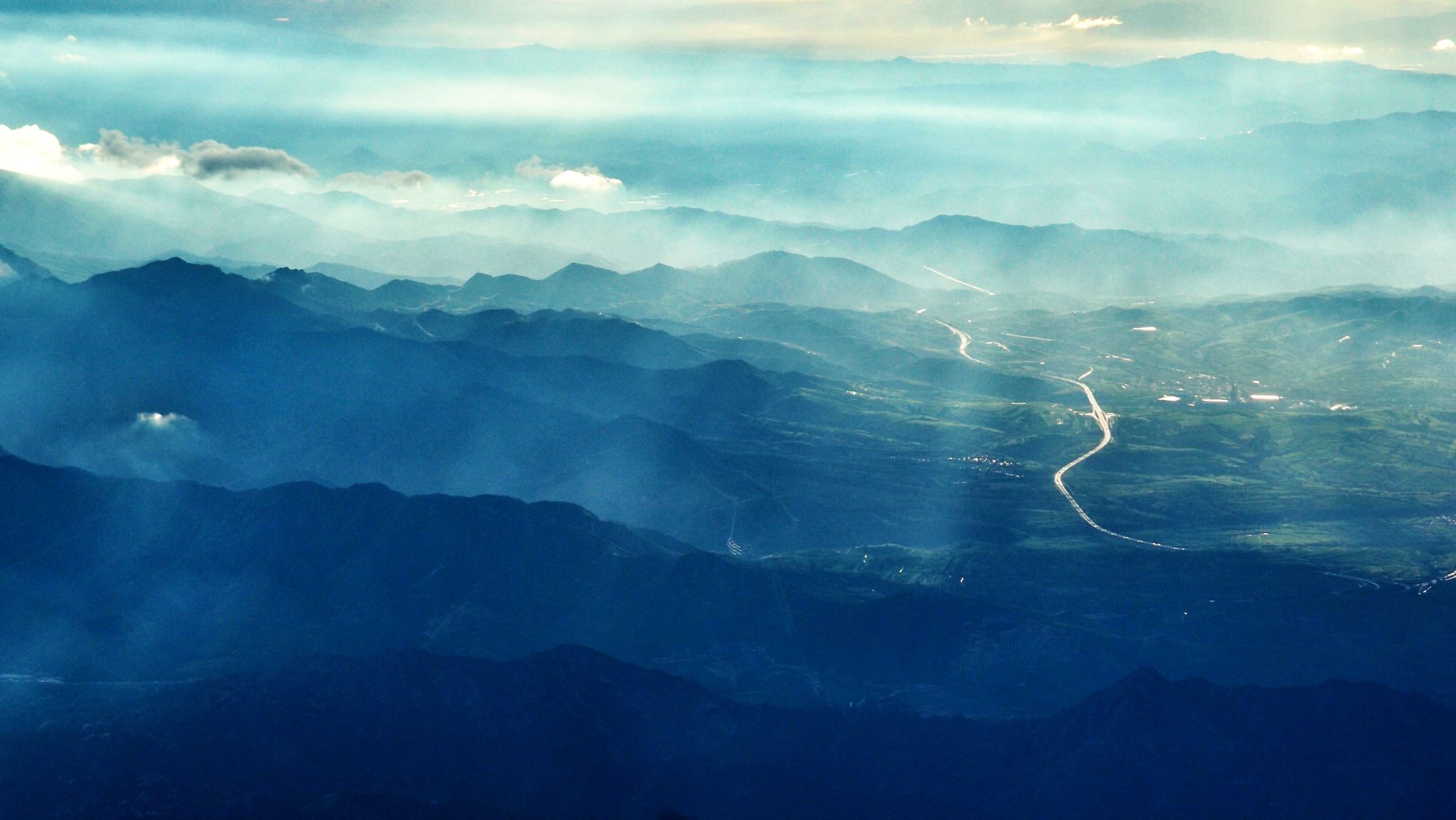该片拍摄于山西省大同市的上空,图片色彩微调。下午18:17分,正值黄昏,阳光以低角度斜射,我透过飞机舷窗观察到云层中的丁达尔效应。该地区属于黄土高原向华北平原过渡的山地地带,兼具山地沟壑与盆地村落等多样景观。低空飞行的独特视角带来了一排排山脉尽收眼底的空间压缩感,一道道光柱润泽着连绵青山和依附于其间的百姓居所,刻画出一幅美好画卷。