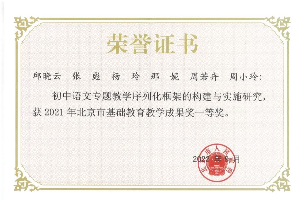 皇冠体育邱晓云教师团队在北京市基础教育教学成果评选中获一等奖