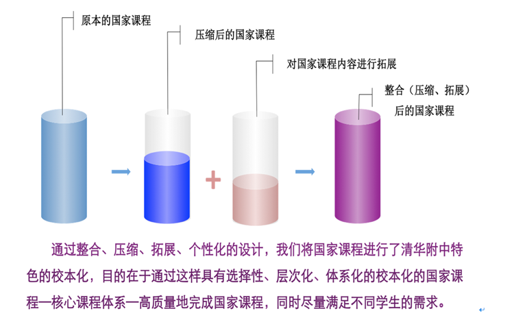 核心课程:为了高质量地完成国家课程、满足学生个性特长需求,根据学生的认知水准,借助自主会考的契机,充分利用我校的传统优势、地域优势和周边的社会资源,将原有的国家课程中同一学科的模块内容进行了重组整合,压缩拓展,并加以开发,创建了三个层级的核心课程:基础类课程、拓展类课程、研究类课程。